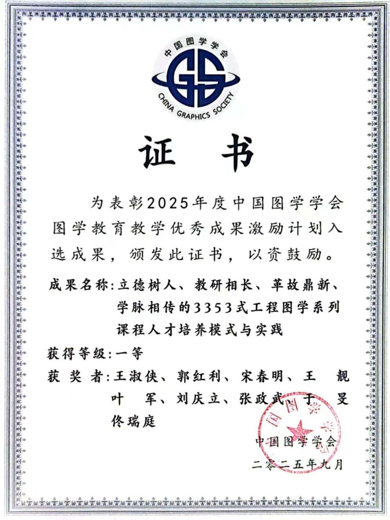 在近期结束的中国图学大会上,由陕西省图学学会推荐的《立德树人、教研相长、革故鼎新、学脉相传的3353式工程图学系列课程人才培养模式与实践》喜获“中国图学学会图学教育教学优秀成果激励计划成果”一等奖。该项目是由西北工业大学、陕西科技大学和陕西理工大学多位老师共同实施,项目主要完成人为西北工业大学王淑侠教授、陕西科技大学郭红利副教授、陕西理工大学宋春明副教授等。该项目通过陕西省图学学会推荐申报,是陕西省图学学会在图学教育教学工作中取得的新突破,也是陕西省图学学会在成果培育和人才托举工作中取得的新成绩。
